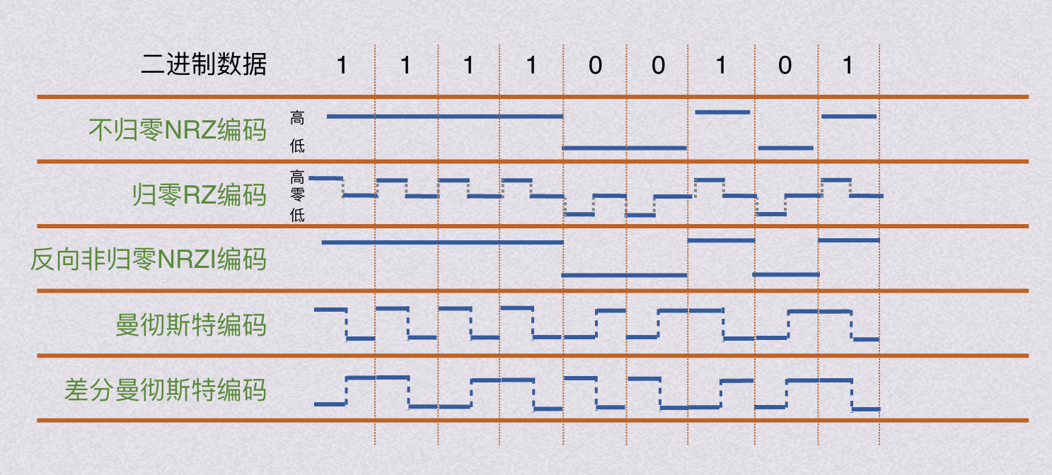 归零编码:⾼电平表示1、低电平表示0(或相反),每个码元中间均跳变到零电平(归零),接收⽅根据归零的跳变调整时钟, 这就为收发双⽅提供了⾃同步机制