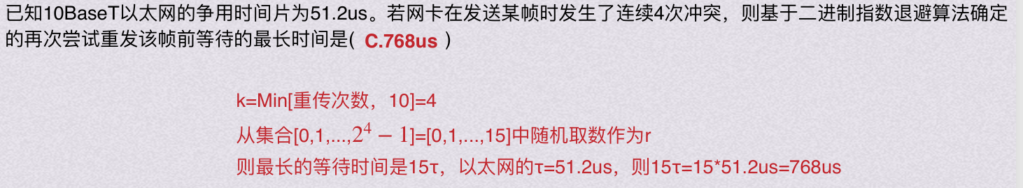 指数退避算法: 基本退避时间为争⽤期2τ,在以太⽹中是发送64B(512b)所需时间51.2us